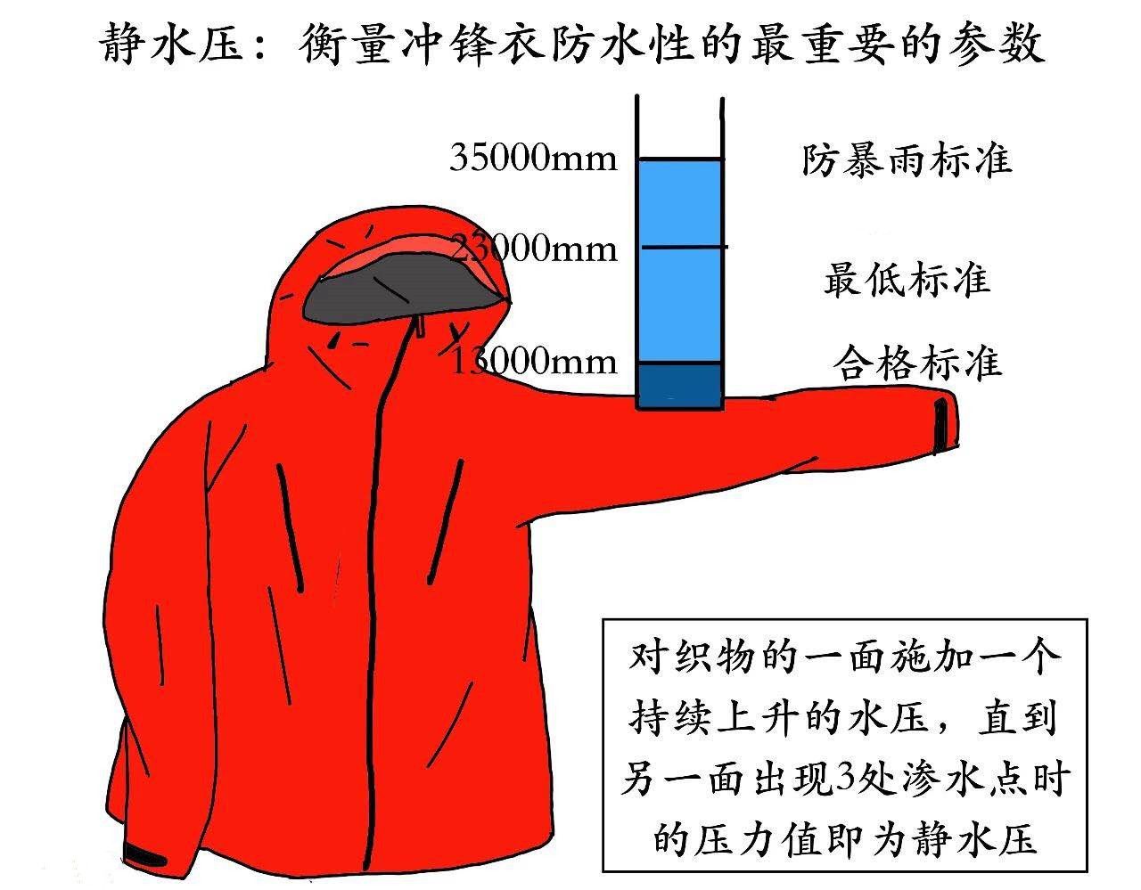 沖鋒衣的防水性能的重要參數(shù)—靜水壓。很多山友們認(rèn)為把水潑在沖鋒衣上,不漏水就說明防水,這個檢驗(yàn)方法是錯誤的!其實(shí),除了水的自然滲透,外界施加的壓力也會迫使水穿透面料。而沖鋒衣的靜水壓的高低即可標(biāo)識它抵抗被水穿透的能力。