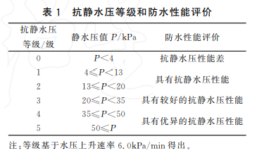 靜態(tài)防水性能是指沖鋒衣抵御雨水浸濕滲透的能力。這是沖鋒衣最基礎(chǔ)的功能,可以有效防止雨雪浸入衣服。這一項(xiàng)可以通過量化實(shí)驗(yàn)檢查——對(duì)織物一面施加一個(gè)持續(xù)上升的水柱,直到另一面出現(xiàn)三處滲水點(diǎn),此時(shí)去水柱水壓值。抗靜水壓等級(jí)和防水性能評(píng)價(jià)表見下圖
