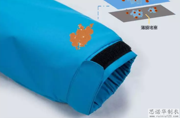 薄膜堵塞:當污垢通過第一層保護層時,很容易開始侵入中間層的薄膜,薄膜被污垢堵塞。 這是整個保護系統(tǒng)的核心區(qū)域,夾克的防水透氣功能慢慢丟失!